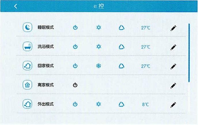 e控模式可以预置睡眠、洗浴、回家、离家和外出五种常用的快捷模式和三种自定义模式。一键开启设置的模式,即能享受到定制的舒适。