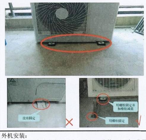 做到外机风扇出风口必须在50公分内无遮挡物,所有落地脚必须安装减震垫,保证外机运转正常。