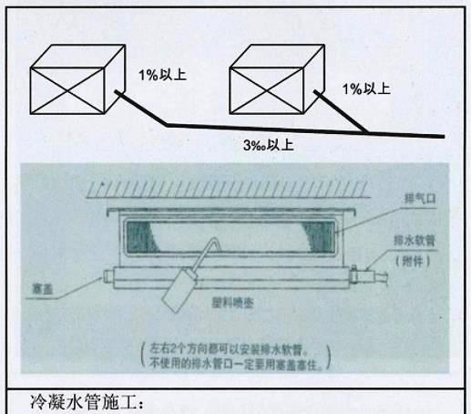 ② 内机吊装需考虑百分之一的坡度,接冷凝水的一侧要稍微低一些,避免冷凝水排不出去。