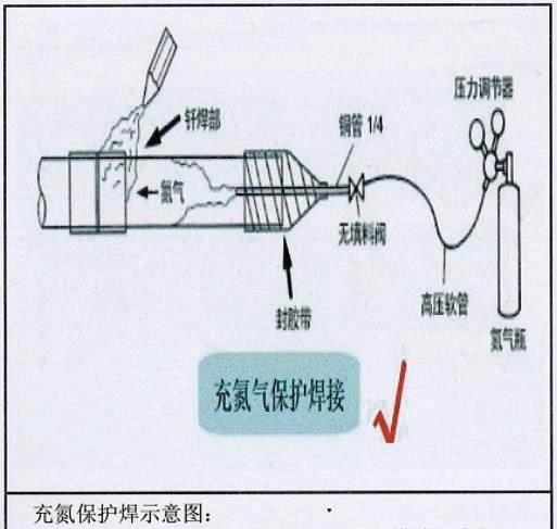 ② 在焊接过程中必须在铜管内冲入氮气(充氮焊接工艺),这使铜管内部没有空气避免了产生焊接使内壁结炭从而在正式运转时入压缩机而产生故障。