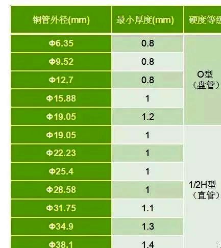 铜管1.采用去油脱磷无缝紫铜管。2.材质、规格应满足现行国家标准GB/T 1527《铜及铜合金拉制管》和GB/T 17791《空调与制冷用无缝铜管》的要求。3.配管的壁厚和硬度必需满足表中的要求。4.应具有出厂合格证、质量证明书。