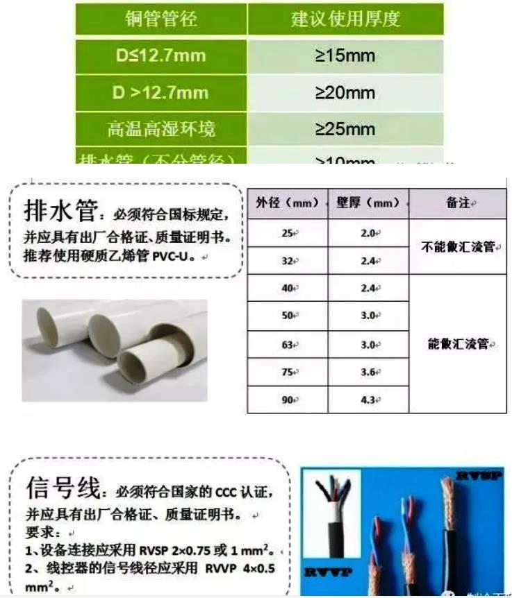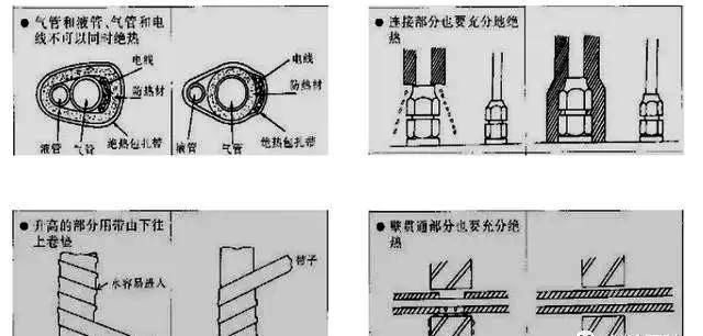1、防止凝露滴水、烫伤、减少热量的损失;2、保温材料具备隔热、阻燃、耐高温等特性;3、所有内、外机的冷媒配管都需要保温(分歧管、接头、弯头等),有缝隙处必须粘贴好;4、气管和液管必须分开保温,同时注意不能紧压保温棉;5、保温材料应满足:20℃时的导热系数λ≤0.040W/( m• K)、湿阻因子≥80。6、保温棉的厚度:铜管外径D≤12.7mm时,厚度≥15mm;铜管外径D> 12.7mm厚度≥20mm。