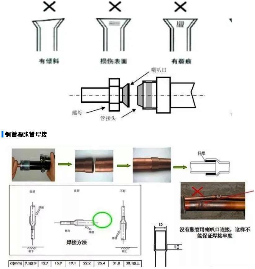 必须使用扩口器扩口,严禁用螺丝刀!扩口开始前一定要先装钠子!完成后检查扩口表面是否色泽均匀,是否圆整,确认无“光环”,无“快口” 更不能有裂痕。否则再从割管开始返工!