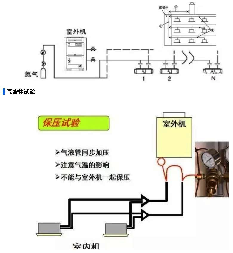 1.加压3kg/cm2,保持3分钟;2.加压15kg/cm2,保持3分钟;3.加压4.0Mpa(未连接室外机组时),保持24小时(注意环境温度的影响)