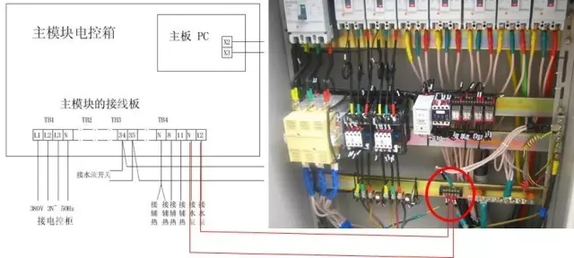 机组联动控制是怎么连接的呢?用一根两芯导线(2X1mm²)将水泵交流接触器自动控制点接至接线板TB4-12、N连接方法如下图: