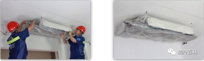 d、室内机包裹防尘罩,防止大量灰尘进入机器内部,影响机器运行效果。保证室内机周围有足够的安装和维修空间,合理的送回风气流组织。
