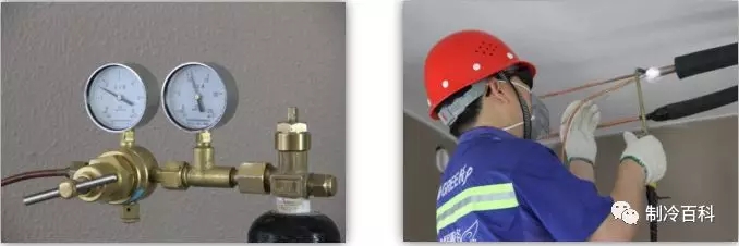 b、确定氮气路径,将氮气管插入到要实施焊接的冷媒管入口处并封口,打开氮气瓶阀门,通过减压阀调节好氮气的气流,最后实施焊接。