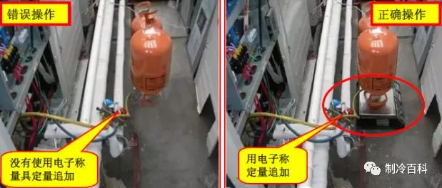 根据实际的液管尺寸和长度,通过公式计算冷媒追加量,将追加的冷媒量记录在室外机冷媒追加表中;绝对不能以测量运转电流,压力等方式估计冷媒量。