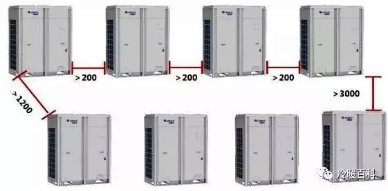 1、对于室外机的四侧与顶部均有墙壁包围的情况,要求设备顶部距离顶墙高度高于3000mm。模块之间距离不得小于200mm。
