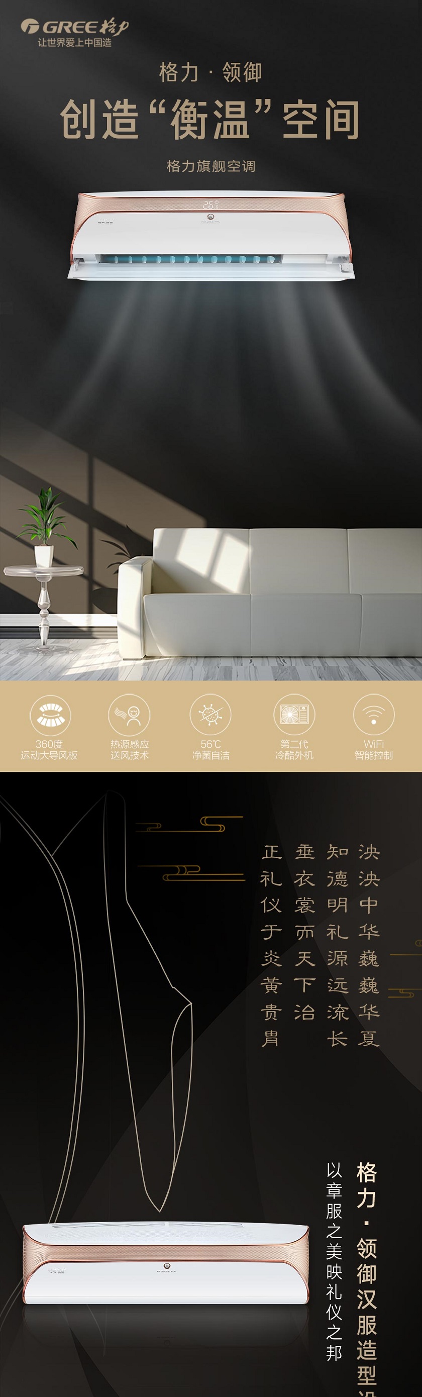 行云流水灵动飘逸,格力领御衡温系列分体空调,以灵秀造型彰显谦和气质,以流畅线条汉服勾勒汉服锦绣.,新国标1级能效,56℃净菌自洁,60度高温制冷,零下30度稳定制热,创造衡温空间