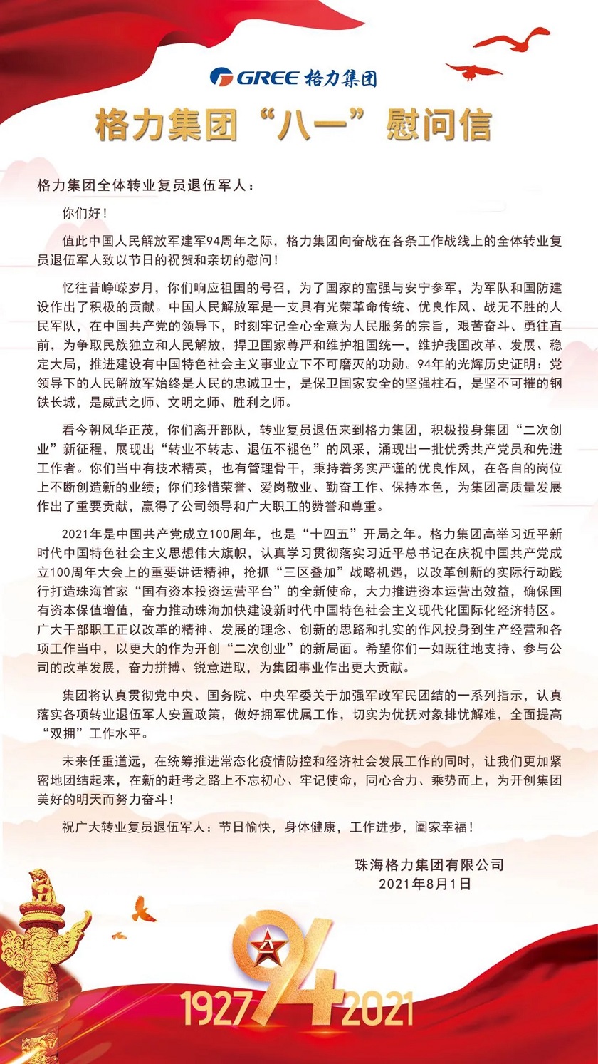 值此中国人民解放军建军94周年之际,格力集团向奋战在各条工作战线上的全体转业复员退伍军人致以节日的祝贺和亲切的慰问!