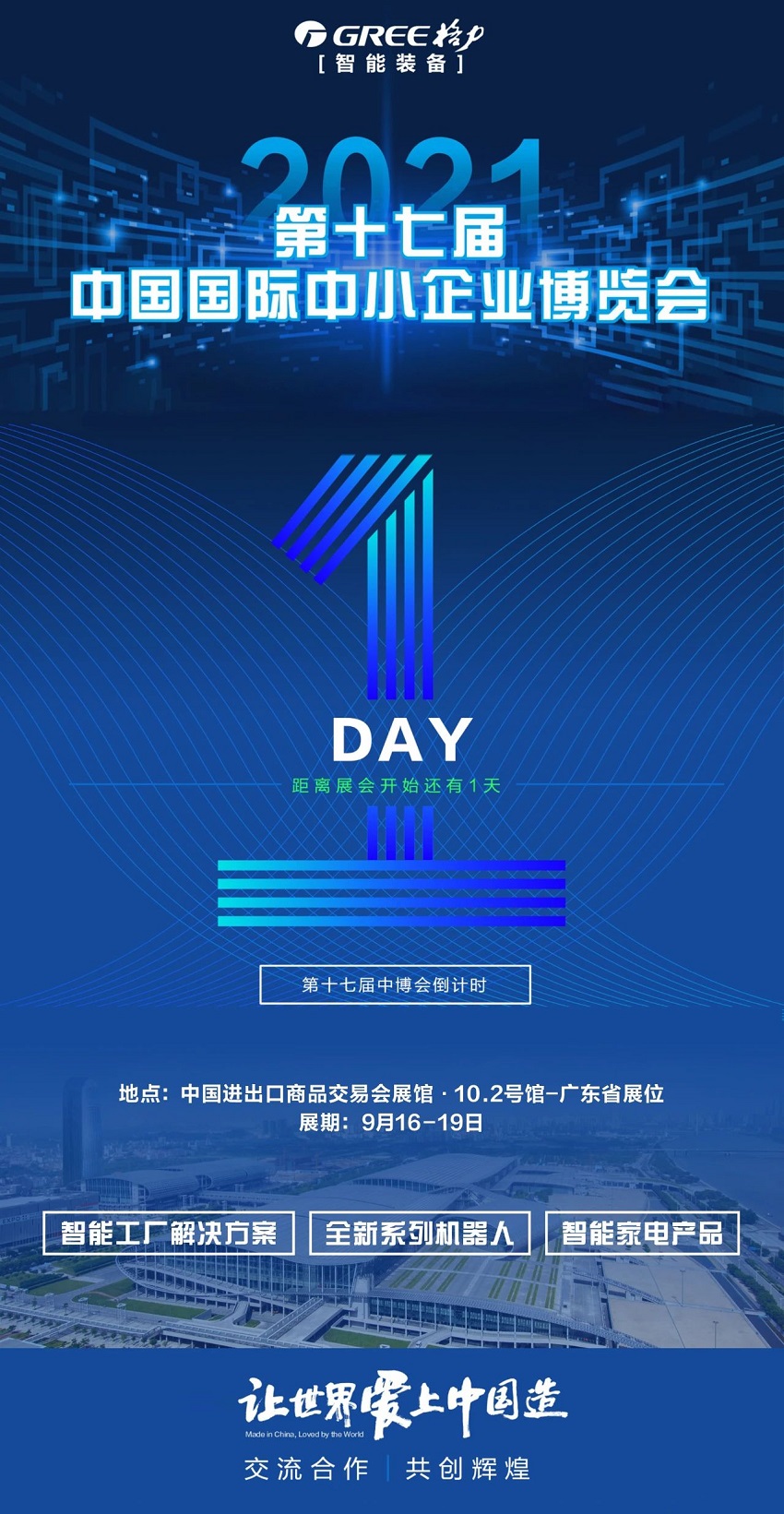 (格力智能装备)第十七届中国国际中小企业博展会倒计时仅剩一天,中国进出口商品交易会展馆10.2号馆广东省展位,展期9月16-19日,智能工厂解决方案,全新系列机器人,智能家电产品...