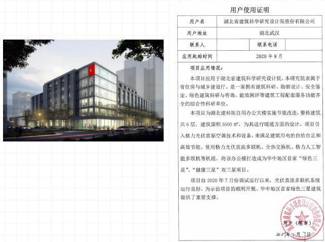 项目简介:湖北省建筑科学研究设计院是湖北省一个建筑工程配套服务功能齐全的综合性科研单位。本项目为该院自用办公大楼实施节能改造,旨将该办公楼打造成为华中地区首家“绿色三星”、“健康三星”双三星项目,整栋建筑共6层,建筑面积5500㎡。顶层使用5套光伏多联机系统,搭配31.9kWp光伏组件,其他楼层使用全热交换机、人工智能多联机等。项目自2020年7月份调试运行以来,运行情况良好,预计每年节约电费3.4万元,于2021年1月得到客户提供的使用报告,得到客户高度认可。