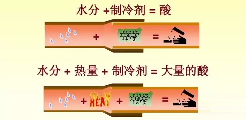 2、腐蚀:水分与制冷剂起化学反应,产生的盐酸、氟酸会破坏压缩机绝缘层。