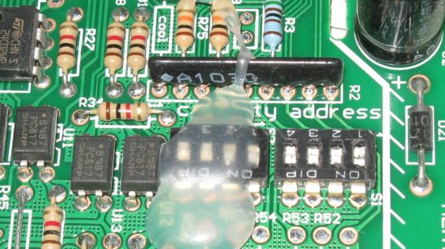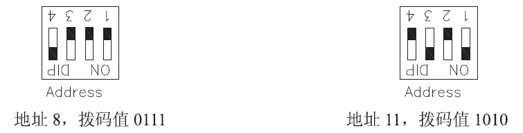 例1:拨码值为“0111”,表示地址为“8”,拨码开关的1、2、3脚拨到数字端,4脚拨到“ON”。