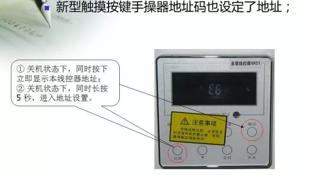 查看线控器地址:关机状态下,同时按“功用”和“形式”键,液晶面板上显现本线控器的地址序号。