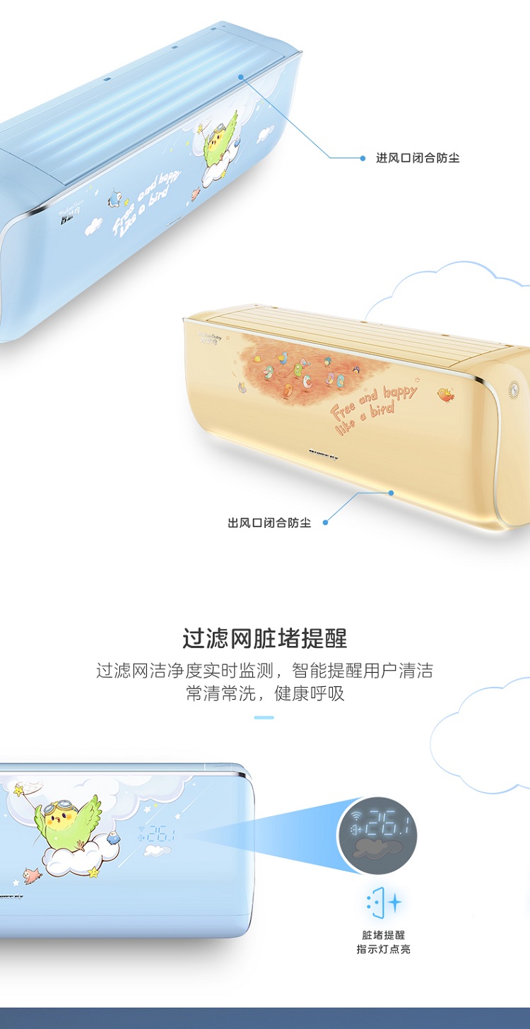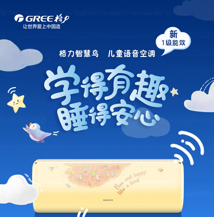 活力黄款智慧鸟格力儿童壁挂式分体空调新国际一级能效26机12至18平方米适用35机16至24平方米适用童趣外观AI萌音科技儿童安心睡眠56℃净菌自洁过滤网脏堵提醒格力冷酷外机