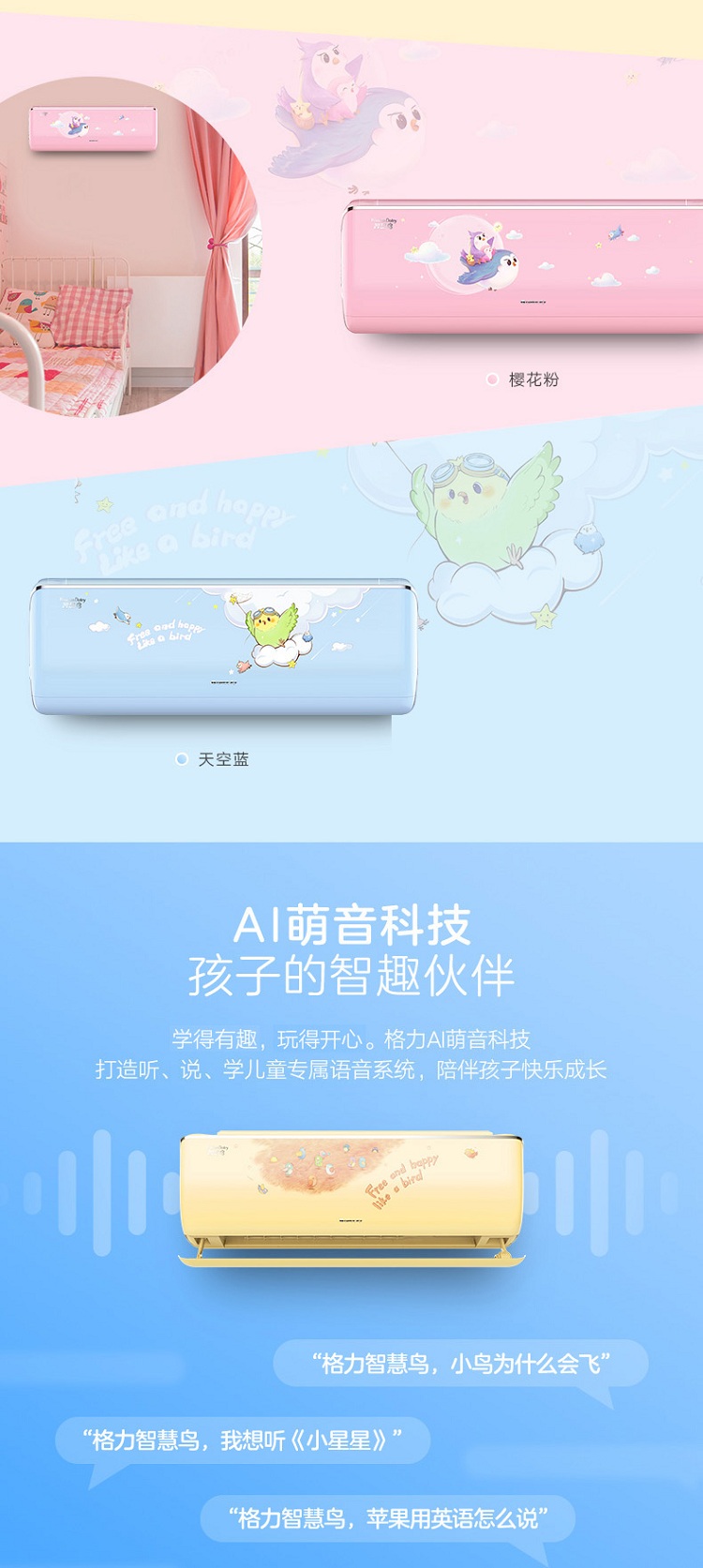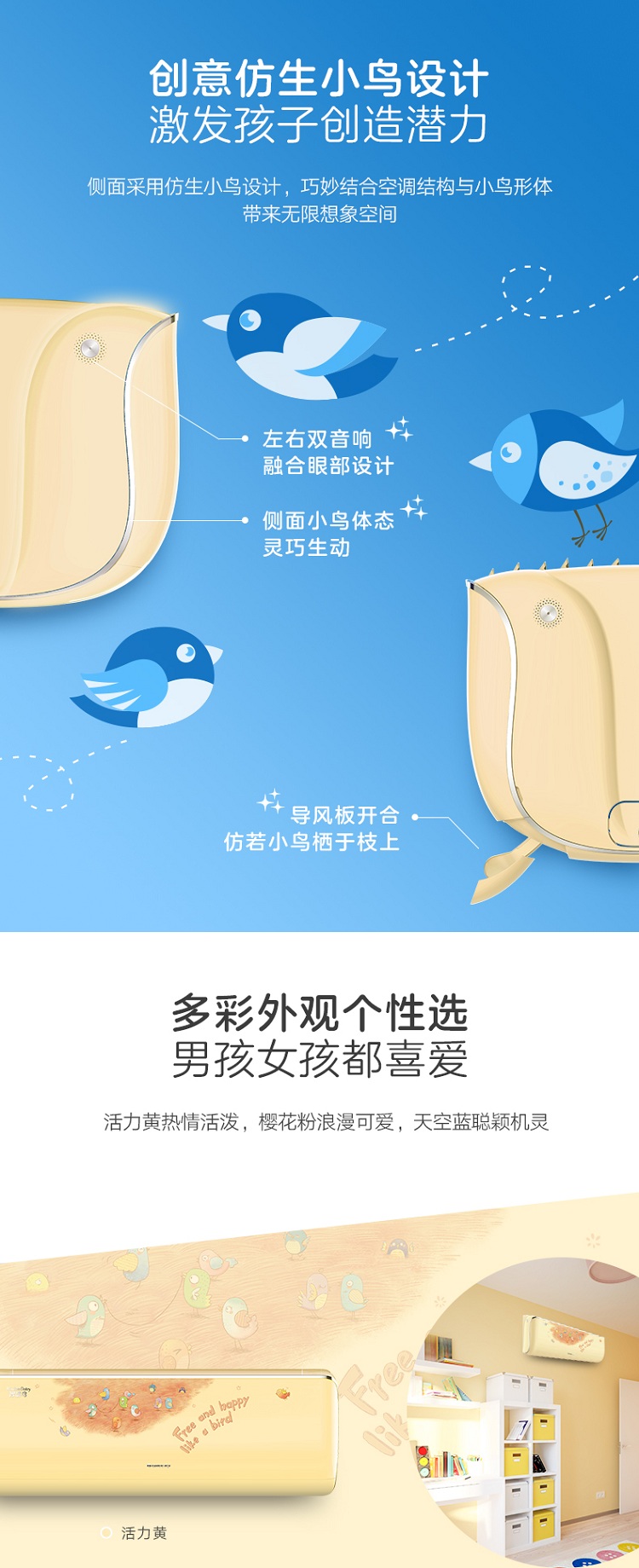 (活力黄)智慧鸟格力儿童壁挂式分体空调变频冷暖新国标一级能效