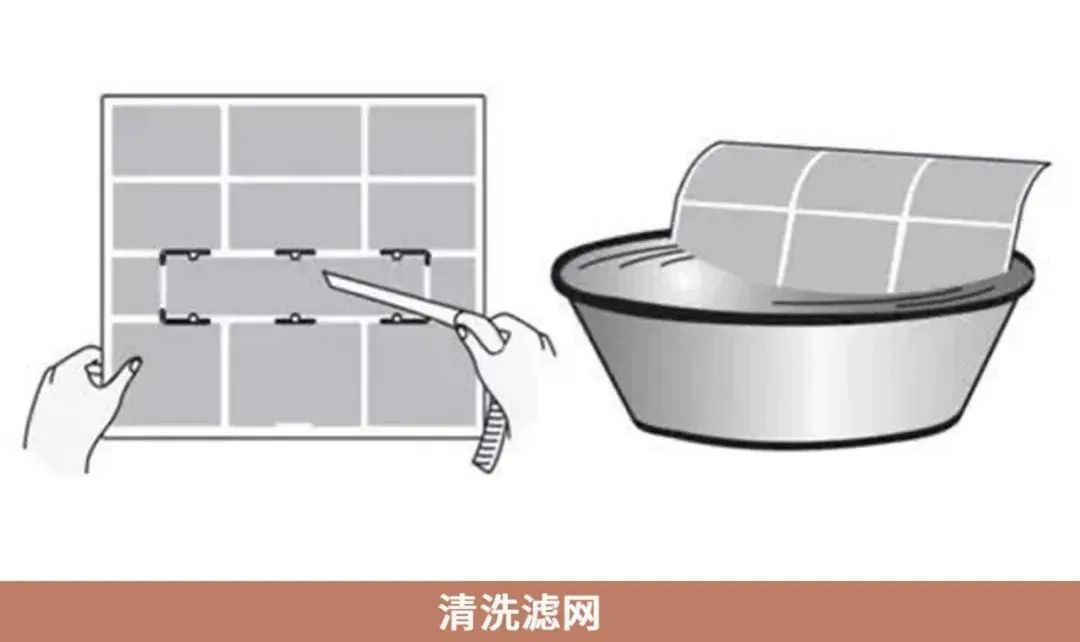 将滤网聚积灰尘的一面向下,用中性洗涤剂或肥皂水清洗,清水冲洗后在阴凉处晾干,不能用高温加热或烘干。(不能用钢球洗刷过滤网,以免损坏过滤网。)