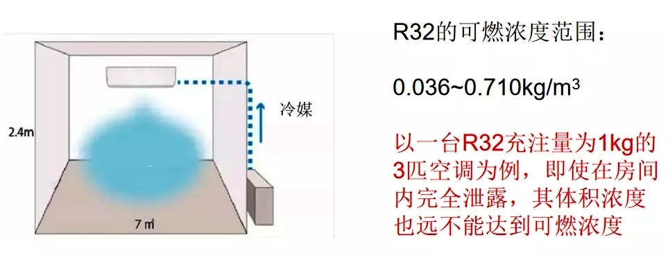 首先,R32的燃点高达648℃,可燃浓度范围较高,就算一台3匹柜机空调的冷媒在房间内全部泄露,也远未达到燃烧极限。