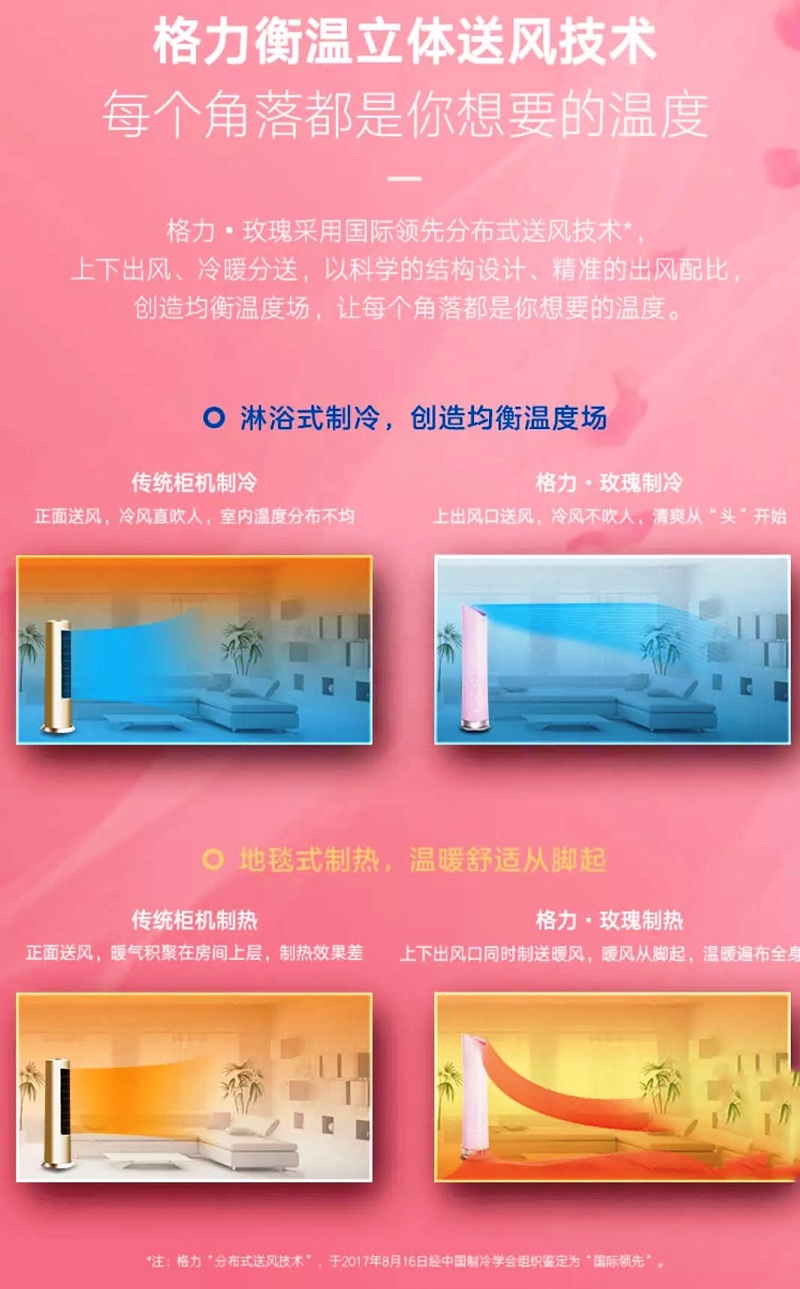 针对使用传统空调时房间温度不均匀、冷风直吹人、热风不暖的问题,格力·玫瑰采用上下出风口冷暖分送设计,让每个角落都是你想要的温度。