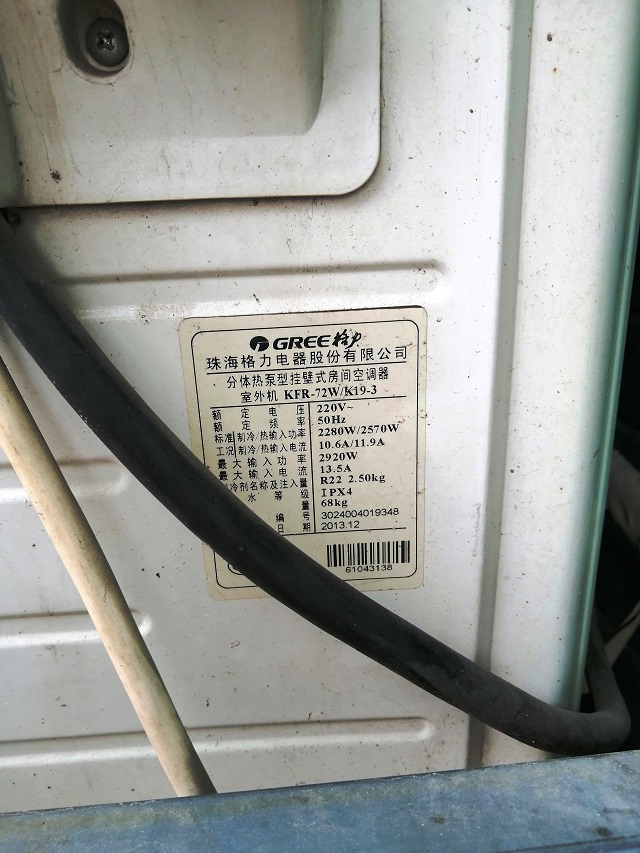 制冷剂名称及注入量 R22 2.50kg