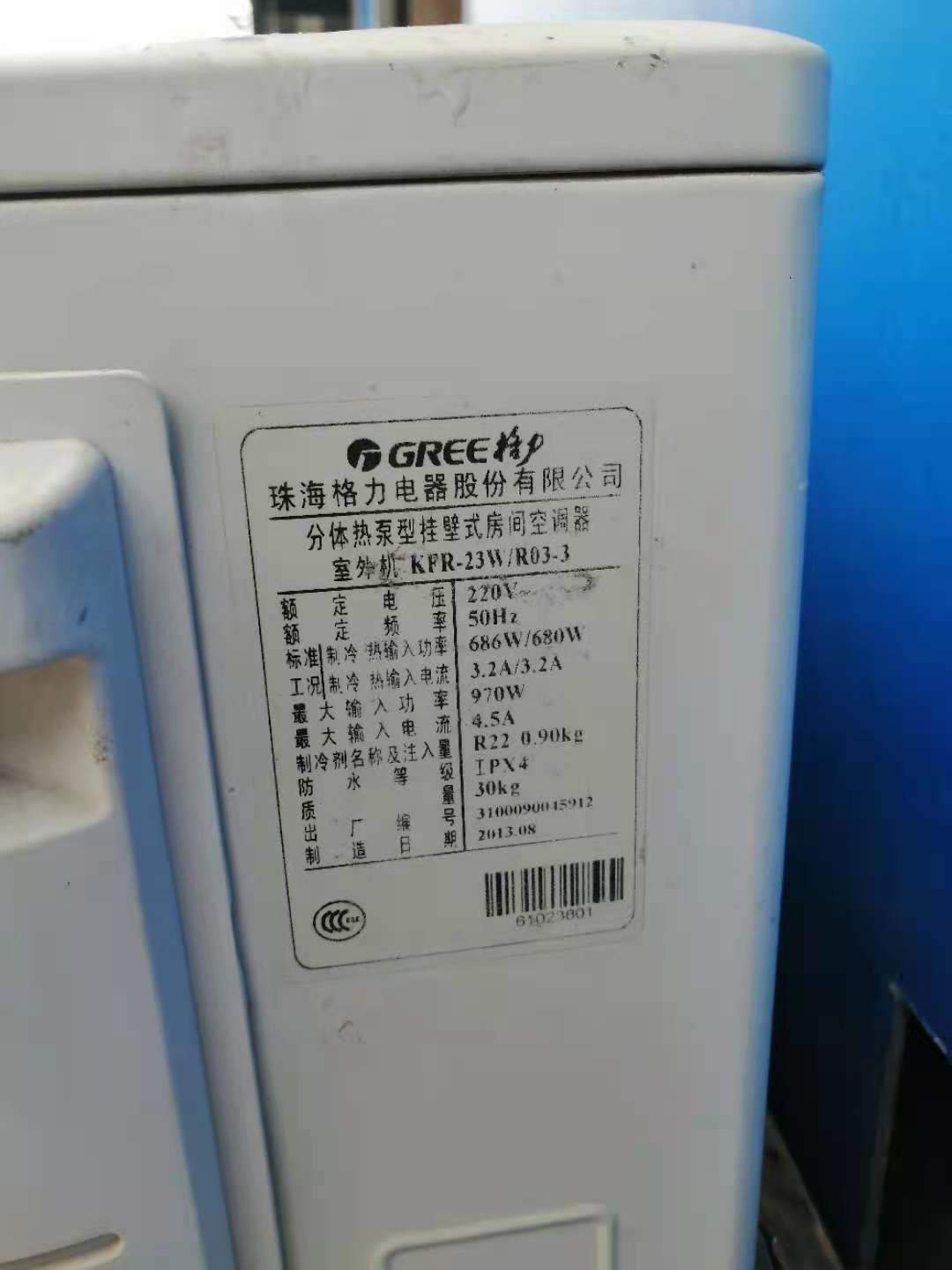 制冷剂名称及注入量 R22 0.90kg