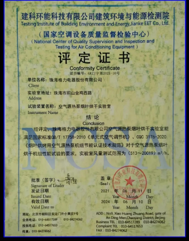 近日,格力电器热泵烟草烘干机实验室经过建科环能科技有限公司建筑环境与能源检测院专业评定,各项指标均符合要求,格力成功拿下全国首张评定证书。