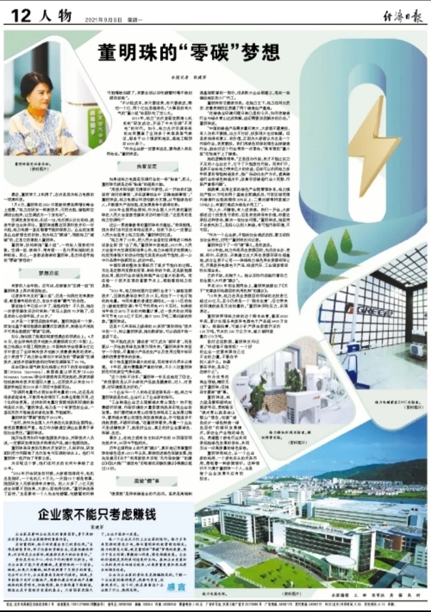9月6日,经济日报刊文:《董明珠的“零碳”梦想》全文讲述为实现人类绿色发展的梦想,董明珠带领格力电器在光伏空调系统、铸造以及再生资源等多个领域取得从“0”到“1”的突破,充分表明“董明珠和格力,以一个企业家的格局、一个家电巨头的未来布局,展现着一种家国情怀。”