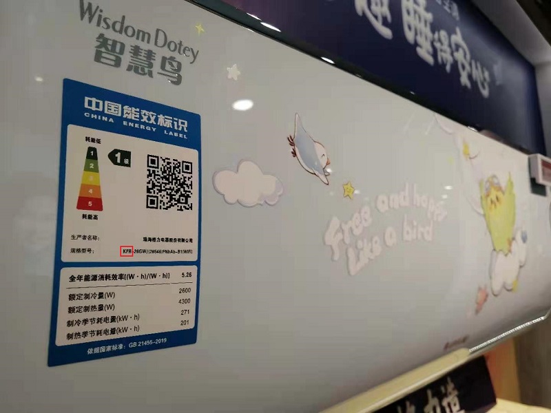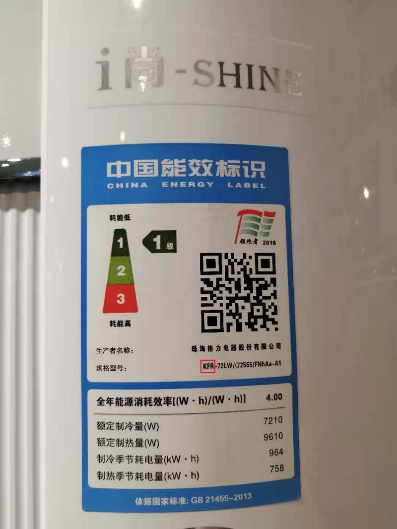 我们首先看分体空调机身,格力分体空调机身铭牌上的"KFR"为“冷热空调机”即制冷制热双向空调,而“KF”则是单冷机,即只能制冷不能制热。