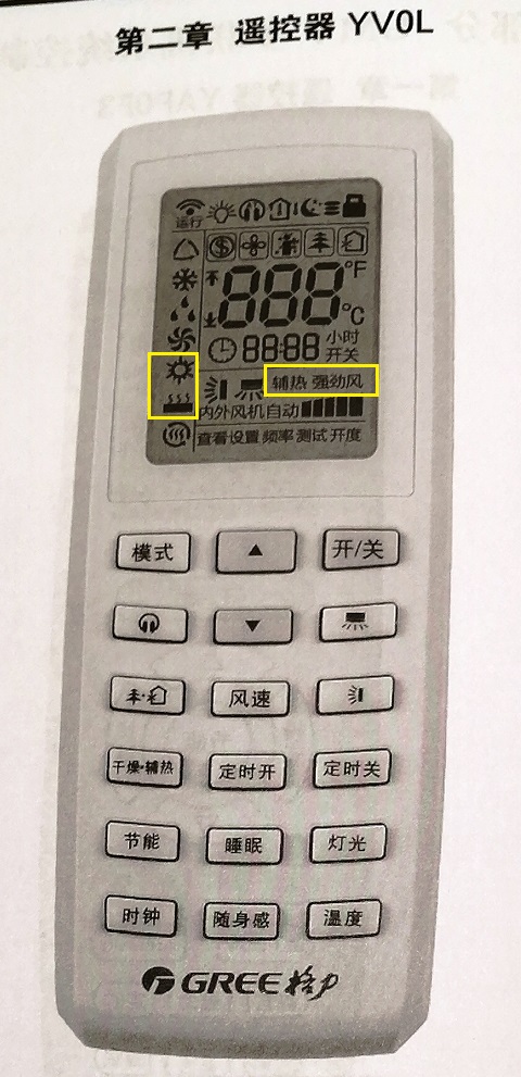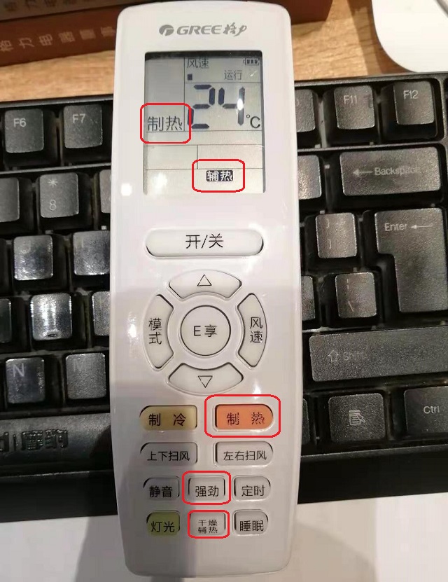 不同型号的空调,遥控器上的制热标志可能略有区别,但实现的功能都是一样的,比如小编办公桌上随手拿起的这个遥控器和上图中的“小太阳”制热标志就不同,另外,除了制热标志外,还有“辅热”和“强劲”标志按键,是室外温度过低或者需要加快室内升温而设置的一个制热辅助功能按键,这两个按键都是与制热标志有直接联系的,如下图