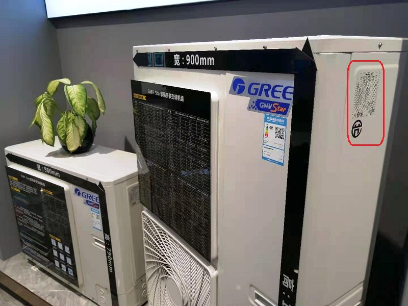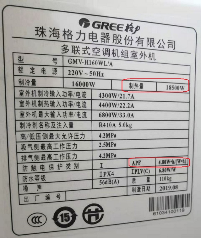 先说外机,如图,每款外机的侧边上都镶有铭牌,上面清楚的写着“制热量”和APF(综合制冷制热效率)参数,便于您和设计师为您的建筑空间匹配热能量,也就是我们说的空调机组选型。