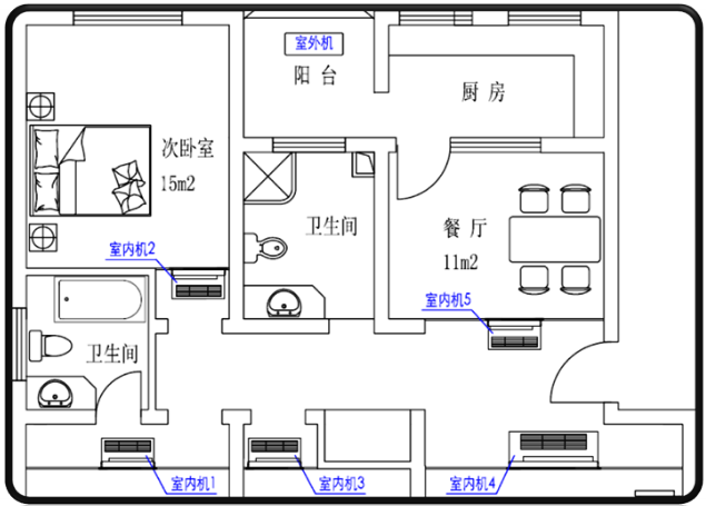 目前住宅层高都比较低,一般在2.6m~2.8之间,因此吊顶空间都不会太高,用的较多是暗装薄型室内机,超薄风管机和一面出天井式,有时也会用明装壁挂式,室外机用220V单相。空间负荷较大时选用超薄风管机,空间负荷较小时选用一面出天井式,卧室/书房/餐厅常规选择:有吊顶选用一面出天井式,无吊顶选用明装壁挂式。